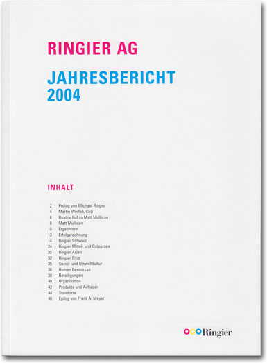 ![]() ![]() Ringier Jahresbericht 2004 Konzept und Gestaltung: Matt Mullican 304 Seiten, 26 x 19 cm |