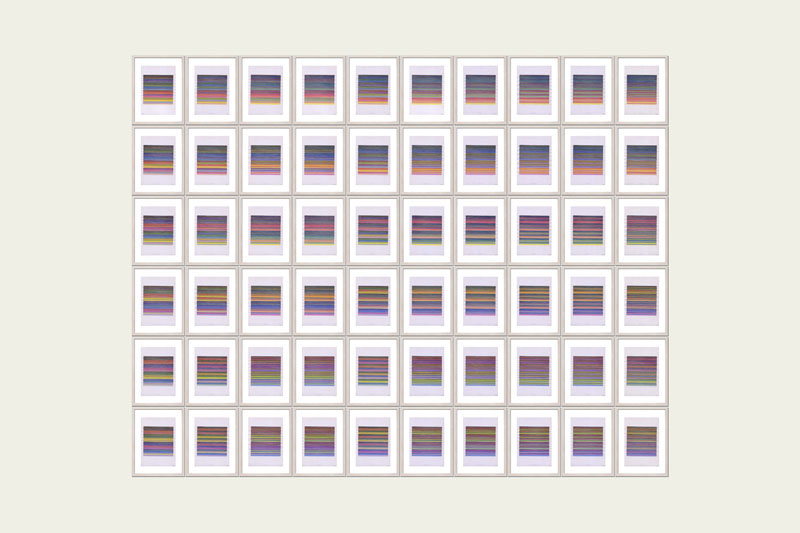 Gesamtansicht, 120 Zeichnungen auf Transparentpapier als 2er Kombinationen in 60 Rahmen.